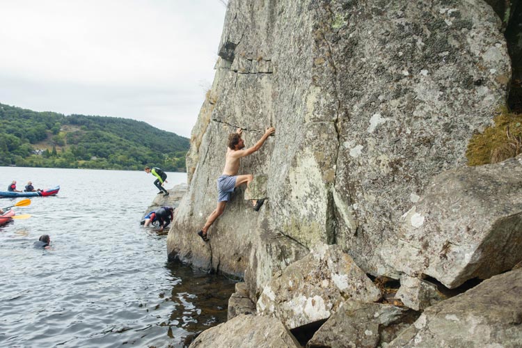 Further down the lake are two more crags that are less popular but have worthwhile routes in a beautiful setting. The first, Clogwyn y Fulfran (locally known as Elephant Rock), is 10 -15 minutes walk from the campsite and has about 10 routes from VS to E2. However, the most unique adventure here is a bouldering/deep water solo traverse around the base of the cliff where it rises out of the lake itself! The difficulty of this is anywhere from 5a to 6a depending on the line taken. Another 10 minutes along the lakeshore lies the crag Penmaen Brith, which has a dozen or so routes, the most popular of which are the lower grade Excalibur (VDiff), which follows a striking diagonal wide crack and chimney, and the Gwynant Needle (VDiff). The Gwynant Needle is an impressive tower separated from the rest of the cliff by a ~3 – 4 m gap. The climb starts up a tight chimney on the left-hand side then spirals around the back then front of the needle, with great exposure at the top. An exhilarating jump can be made from from the top to the main cliff, or a rappel for the more faint-hearted. Harder routes are possible up the front of the needle. For more details of these and other climbs in the area see the Tremadog guide by the Climbers Club.