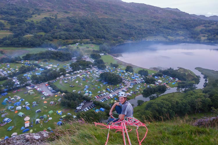 If you are not camping with us you can access the climbs by parking in the lay-bys on the A498 beside the lake and follow the public footpath around the lake, through the campsite and over the old stone bridge. If you park on the campsite or on the campsite access road you will be charged the day parking fee, check our Prices page for the current rate. In addition to the climbing within walking distance of the campsite, many world-class crags are within 20 minutes drive, including the cliffs of Llanberis Pass, Tremadog, and the Ogwen Valley.